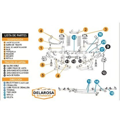 Amortiguadores, Bases de amorti., Bujes, Cubre polvos, Gomas de barra, horquillas, Rotulas, Resortes, Soportes, Tornillos Estabilizadores